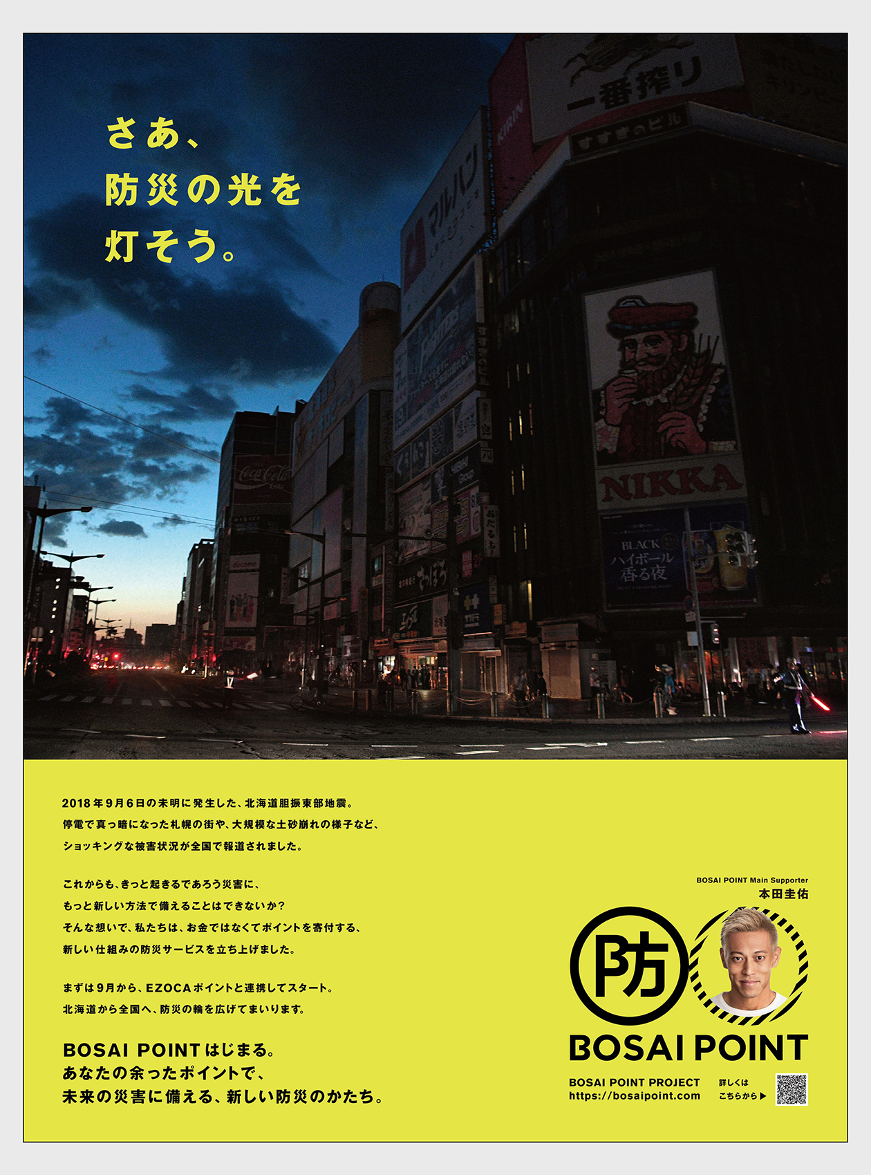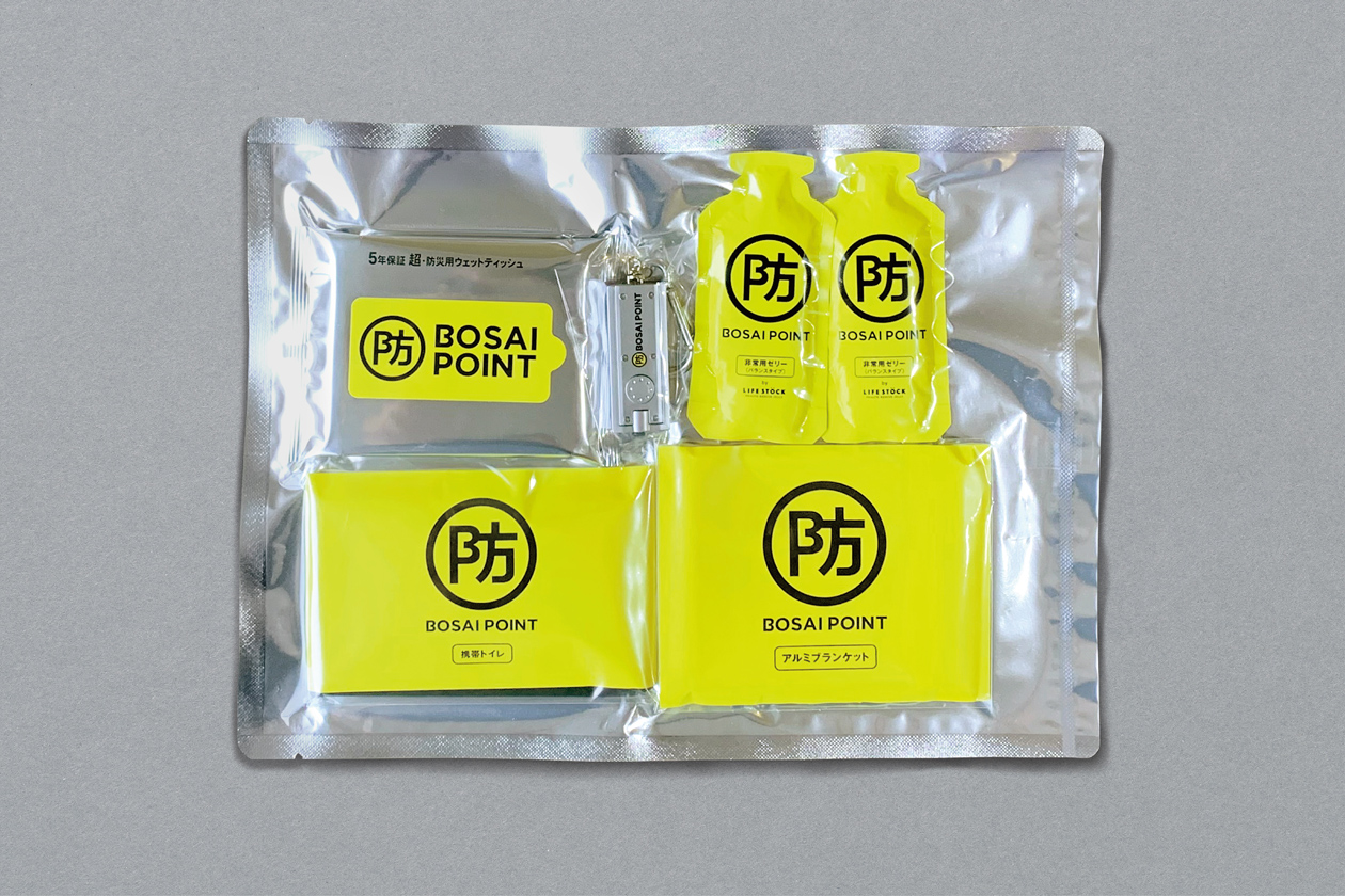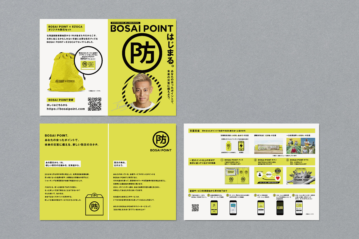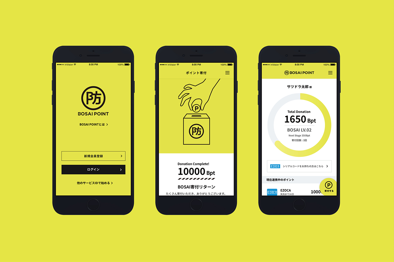 余ったポイントを寄付する、新しい仕組みの防災サービス「BOSAI POINT」のブランディングプロジェクト。ロゴ、UI、キービジュアル、グッズ等のデザインを担当。 象徴的な防マークを軸に、火消を彷彿させるようなトーンで様々に展開しています。
