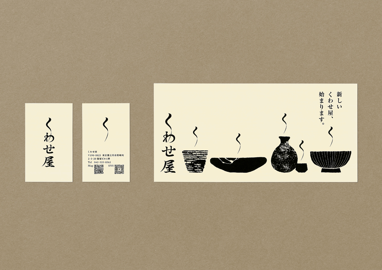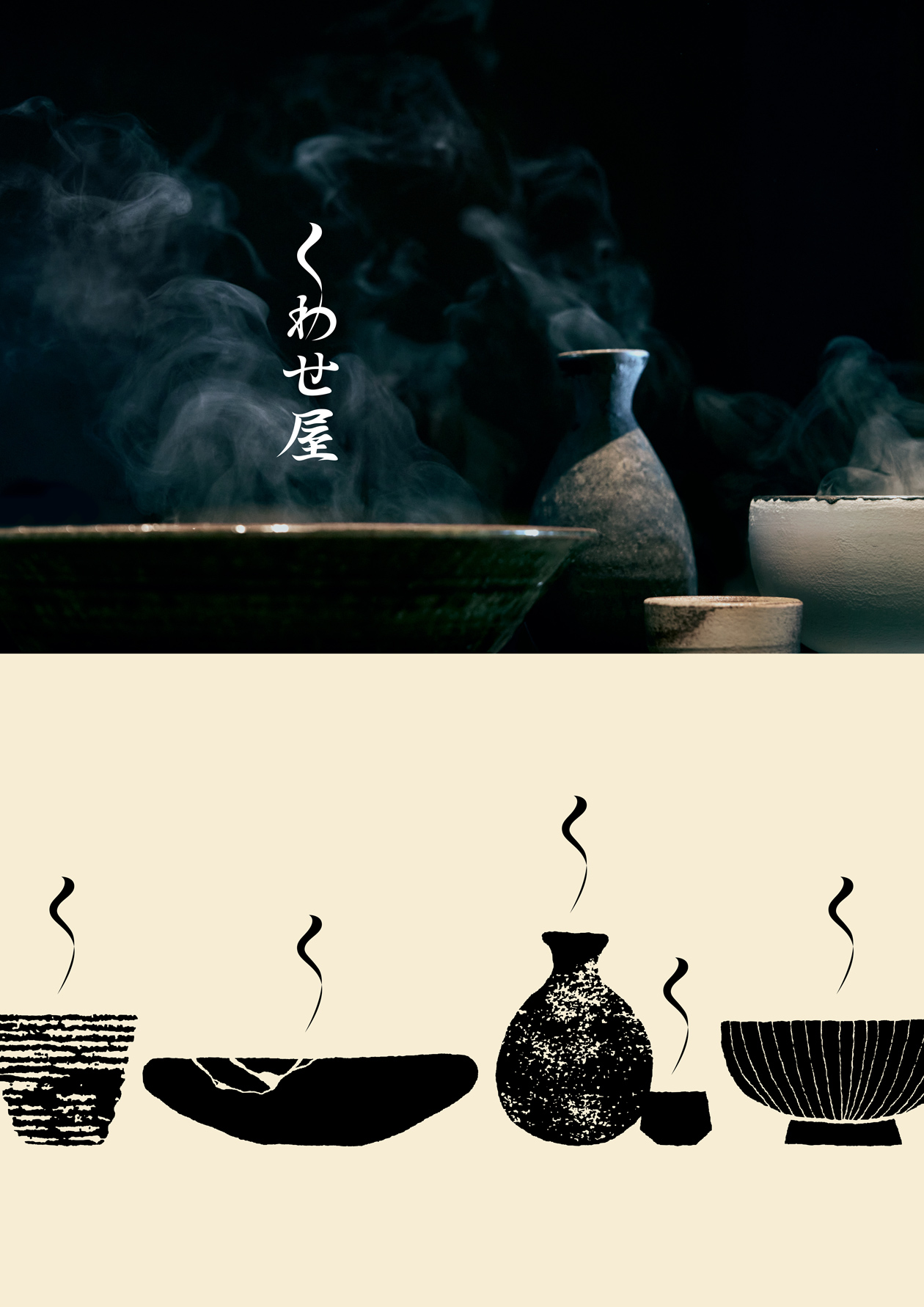 Rebranding project for Tachikawa's izakaya "Kuwaseya". We worked on a wide range of projects including concept creation, logo, in-store tools, and signage design. We created a logo featuring a "ku" which represents the steam that represents freshly made food, which is deployed in a variety of tools.
