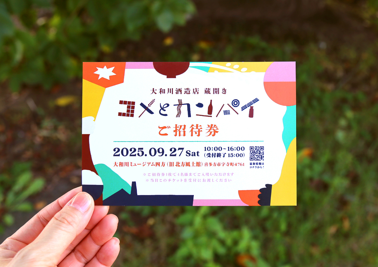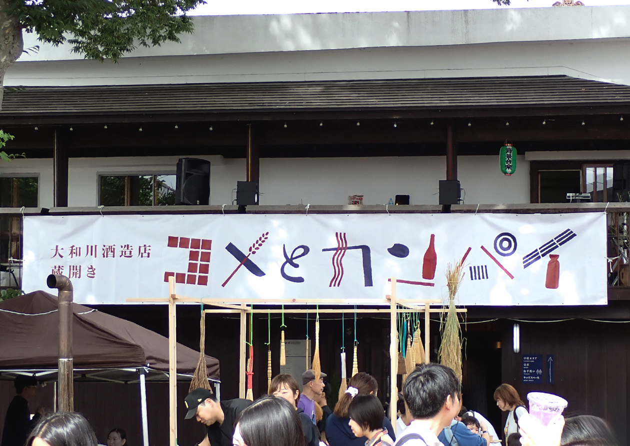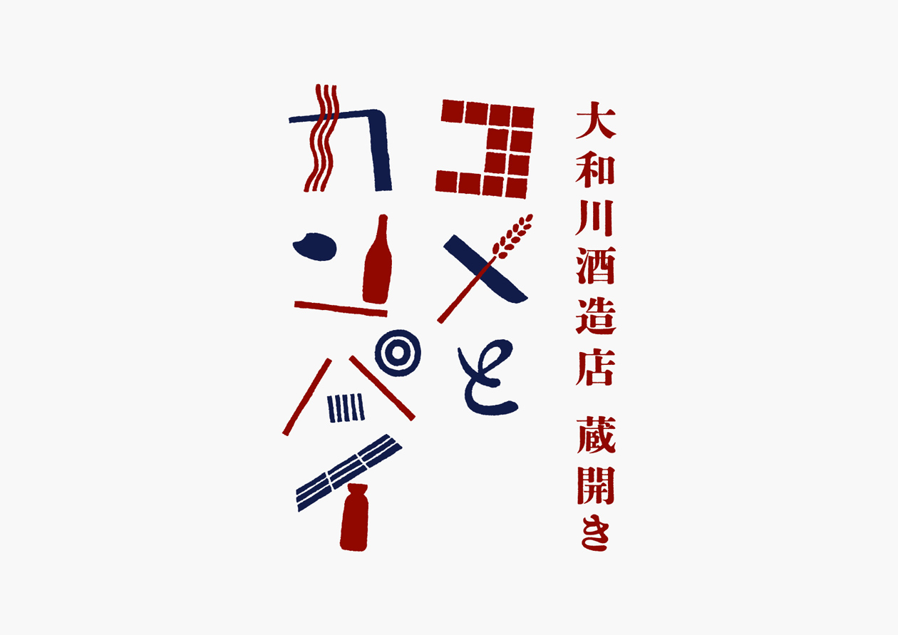 喜多方にある大和川酒造店の初となる蔵開き「コメとカンパイ」のディレクション・デザイン。寛政二年(1790)創業の大和川酒造店は「弥右衛門」をはじめとした銘酒作りだけでなく、農業や、再生可能エネルギーをメインとする電力会社設立など時代に合わせながら進化し、米、水、技術、エネルギーの地産地消を目指す酒蔵です。そんな酒蔵の蔵開きに相応しいコンセプトとして「米 ✕ 酒 ✕ 今 = ワクワク」を立て、米と酒を軸にしながら、“今”のおいしさやたのしさを老若男女みんなに体験してもらう蔵開きを目指しました。