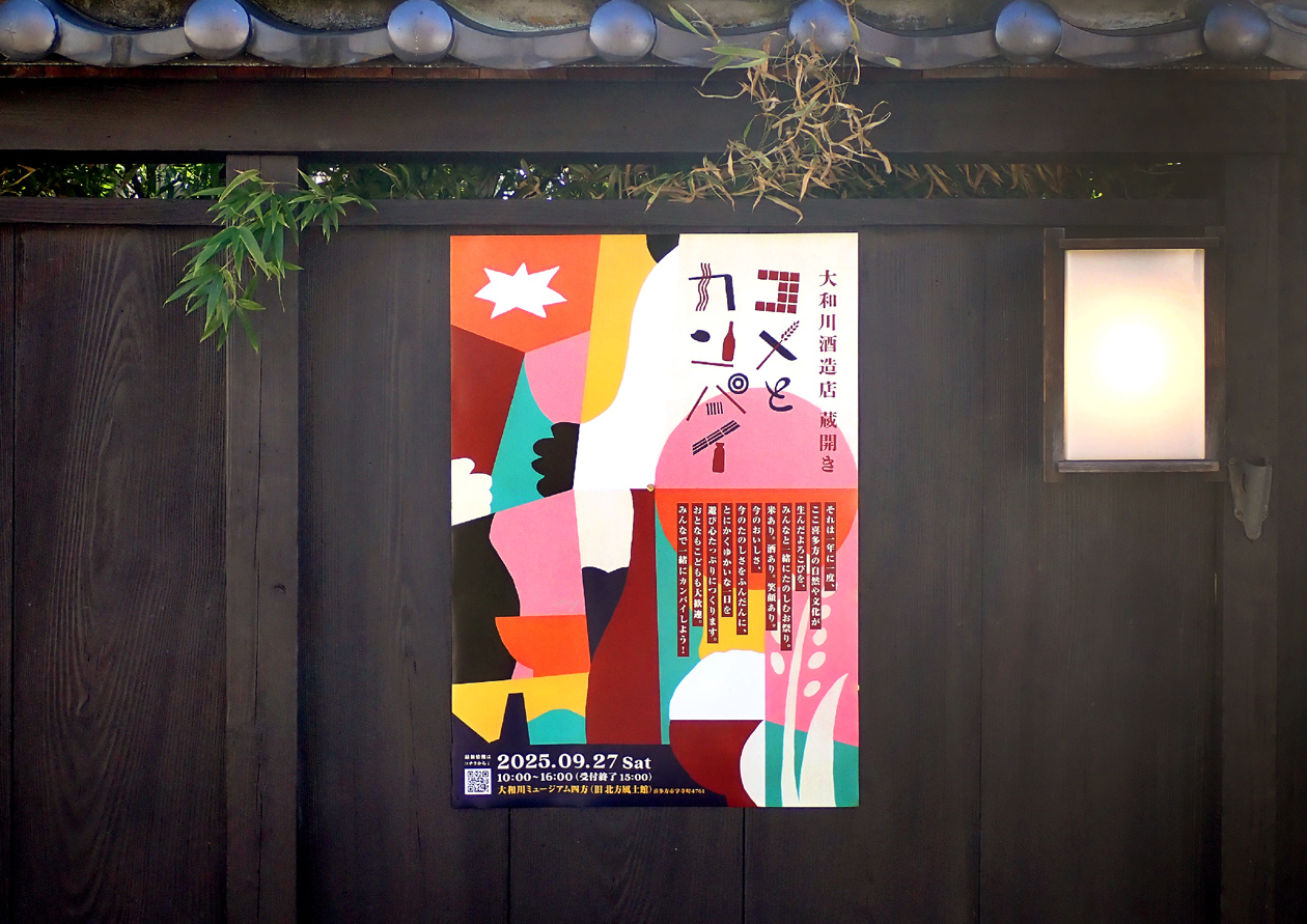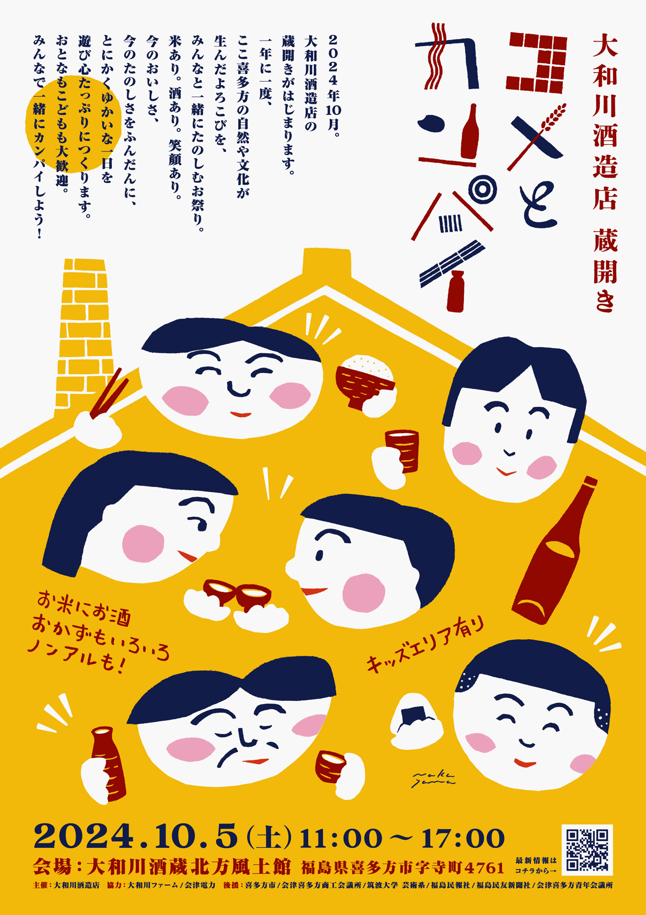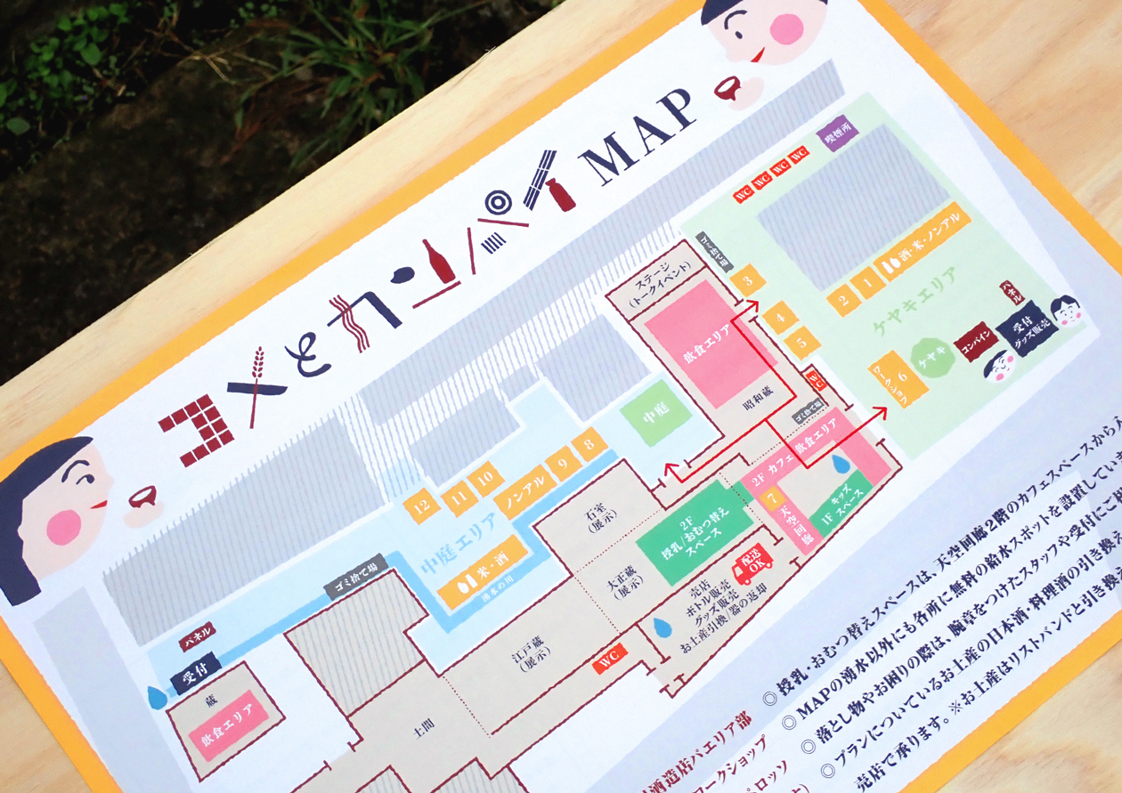喜多方にある大和川酒造店の初となる蔵開き「コメとカンパイ」のディレクション・デザイン。寛政二年(1790)創業の大和川酒造店は「弥右衛門」をはじめとした銘酒作りだけでなく、農業や、再生可能エネルギーをメインとする電力会社設立など時代に合わせながら進化し、米、水、技術、エネルギーの地産地消を目指す酒蔵です。そんな酒蔵の蔵開きに相応しいコンセプトとして「米 ✕ 酒 ✕ 今 = ワクワク」を立て、米と酒を軸にしながら、“今”のおいしさやたのしさを老若男女みんなに体験してもらう蔵開きを目指しました。