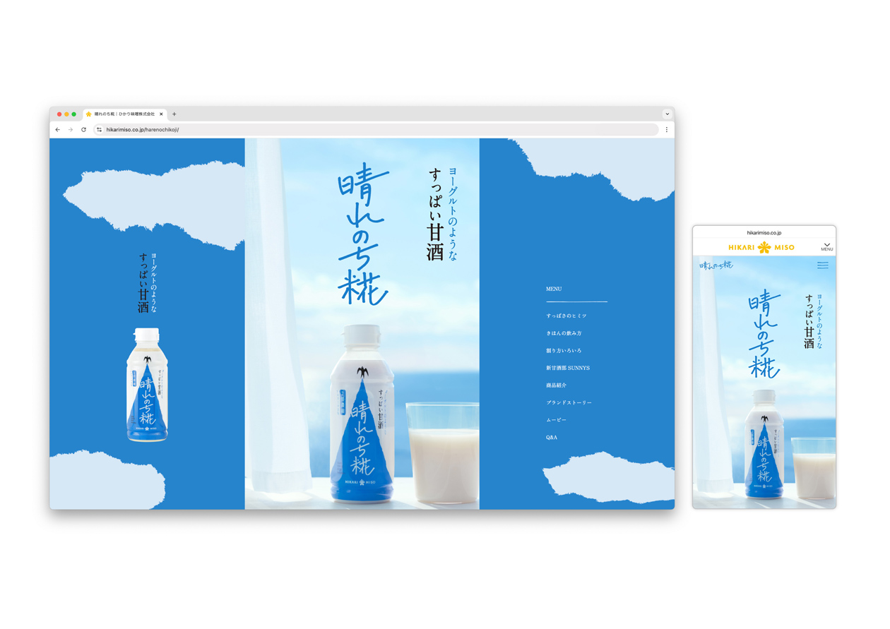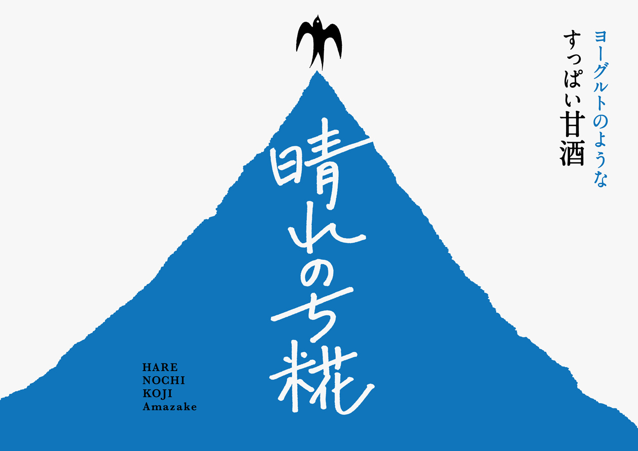 We designed the logo, packaging and web design for a new sensation, the yoghurt-like sour amazake " HARENOCHI KOJI Amazake ". The image of a sour and refreshing taste that makes the drinker feel refreshed was expressed in the image of swallows breaking the clouds and the blue sky spreading out. The aim was to create a design that was both new and unique to amazake, a traditional Japanese fermented beverage.