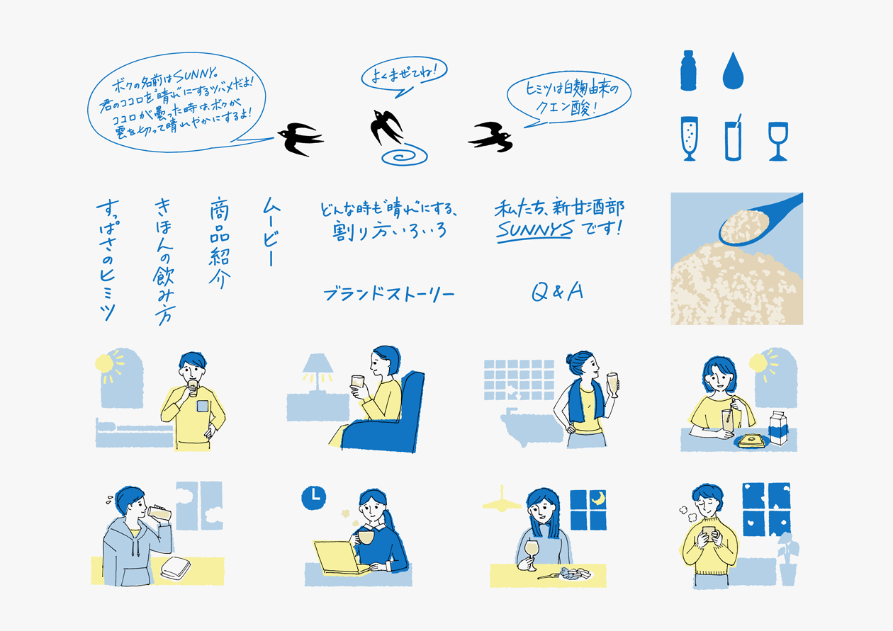 新感覚、ヨーグルトのようなすっぱい甘酒「晴れのち糀」のロゴ、パッケージ、Webデザインを担当しました。酸味のある爽やかな味わいが、飲んだ人の気分を晴れやかにするイメージを、ツバメが雲を割って青空が広がる様子で表現しました。日本の伝統的な発酵飲料である甘酒らしさと、新しさを兼ね備えたデザインを目指しました。