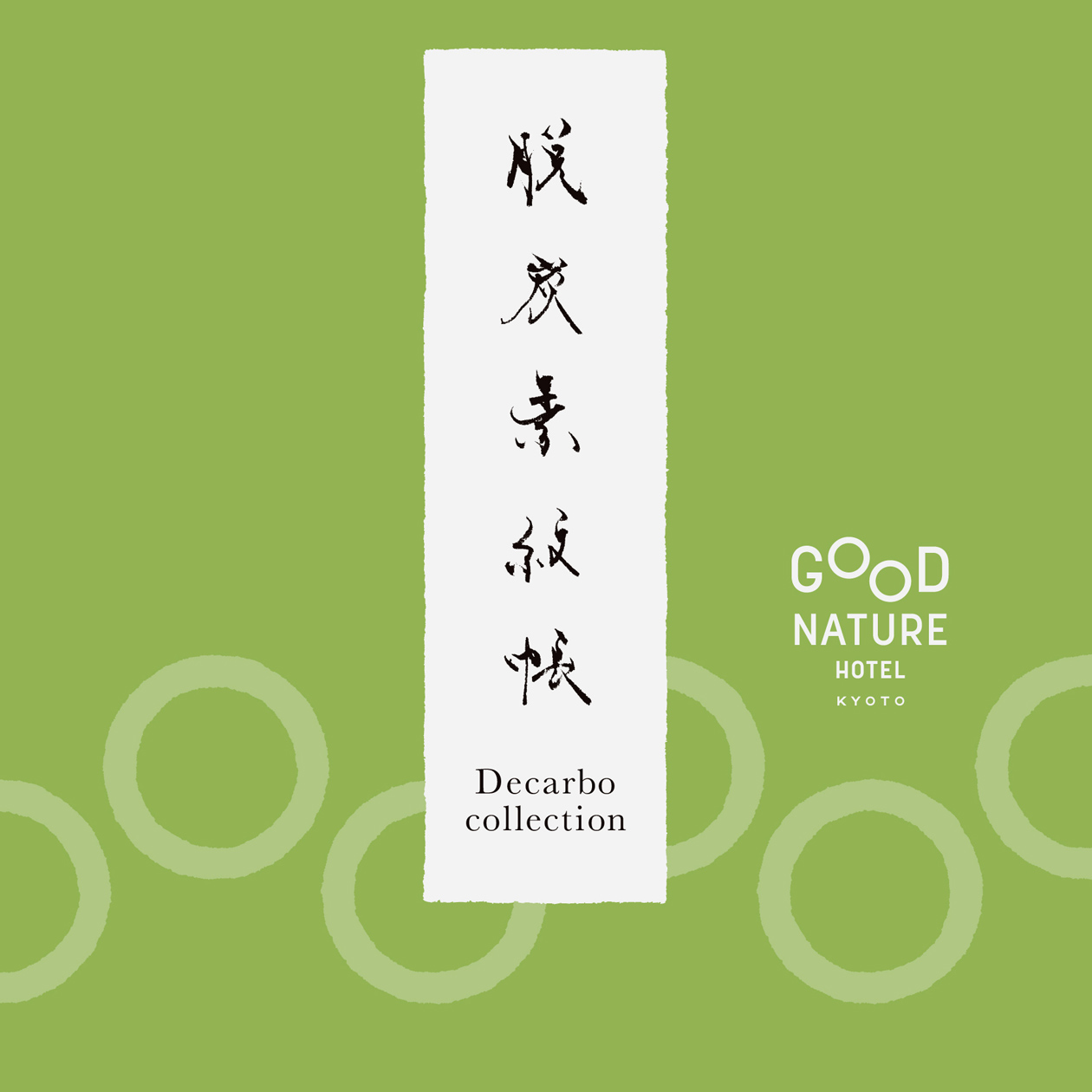 心地よさと地球環境にも配慮したライフスタイル体現型ホテルGOOD NATURE HOTEL KYOTOと、商品やサービスのCO2削減率を可視化した「デカボスコア」などを運営するEarth hacks株式会社によるイベントの企画とデザインのプロジェクト。「脱炭素紋帳」と題して、ホテル内で使用できる商品やサービスのオリジナル家紋を作成し、「デカボスコア」を巡るスタンプラリーを企画。スタンプを全て集めると「GOOOOOOD」の文字が完成する、遊びのある家紋帳をイメージしてデザインした。