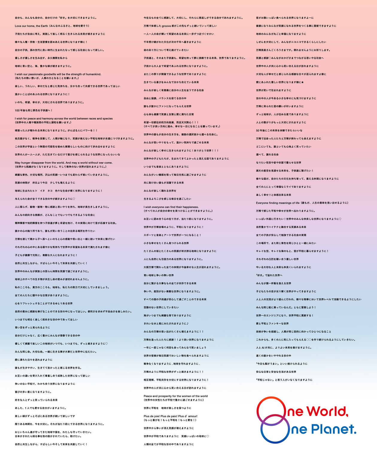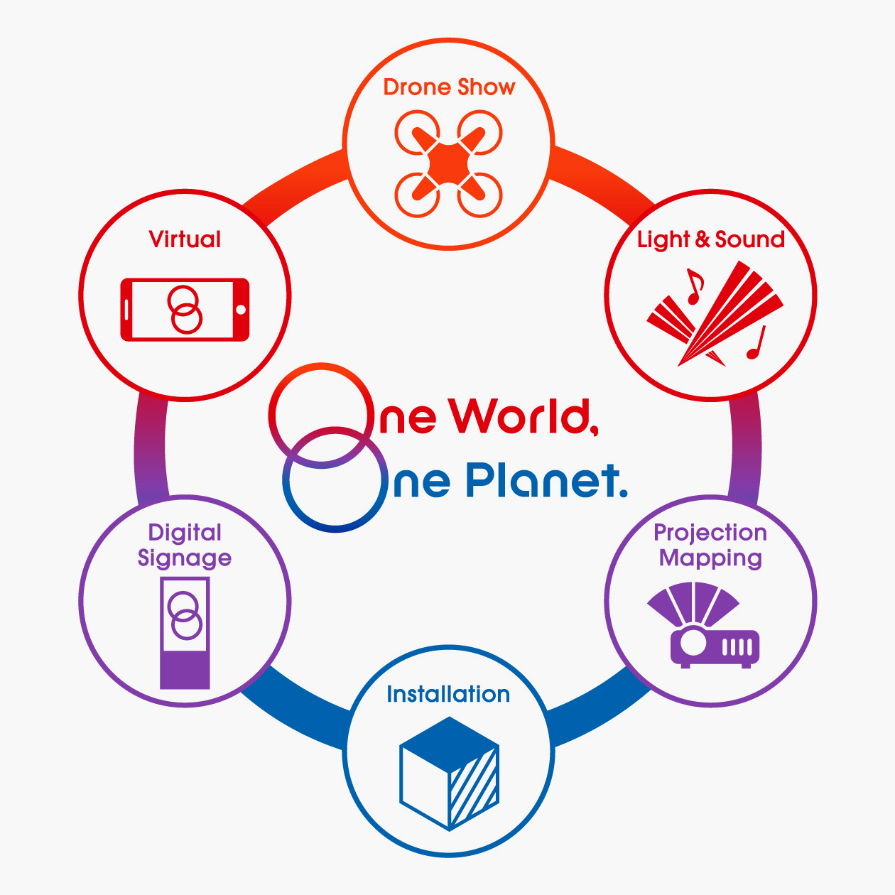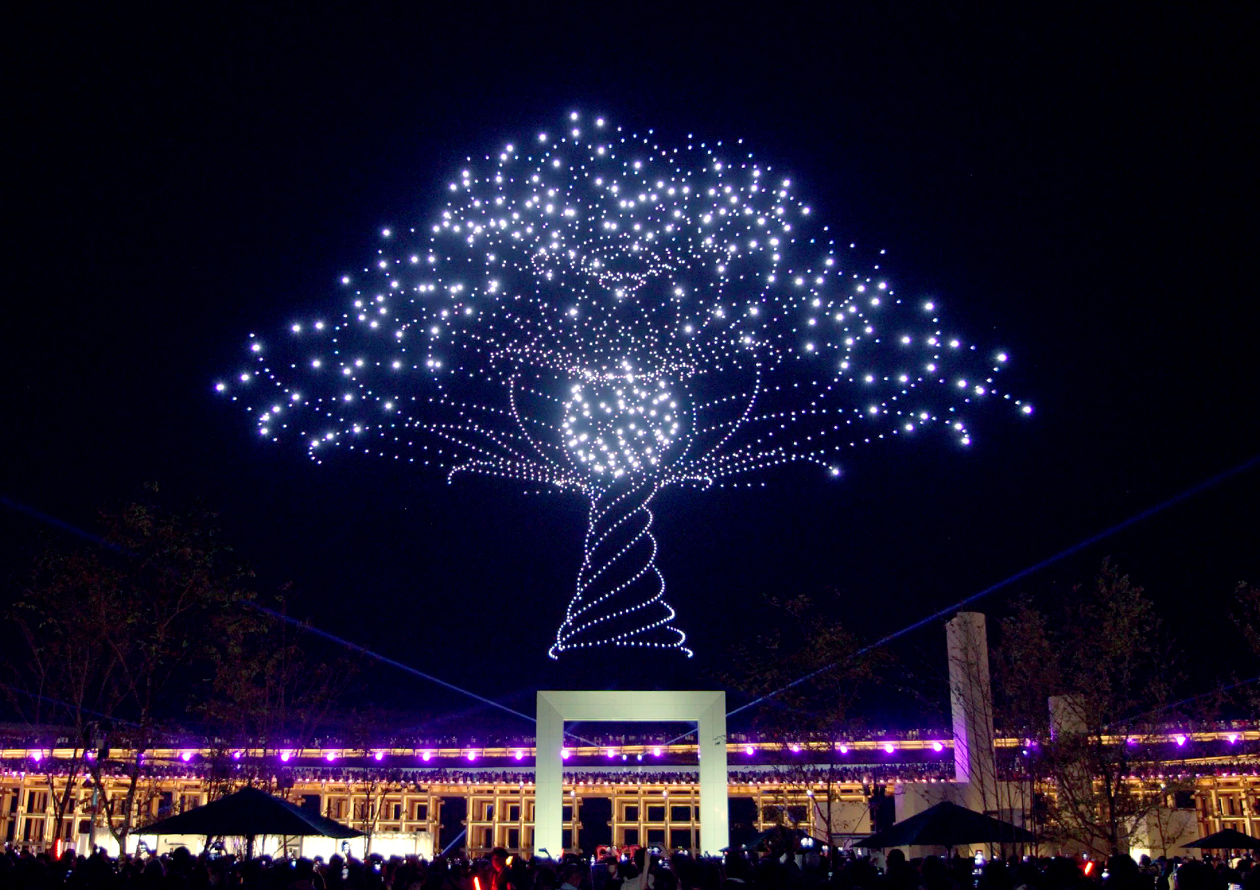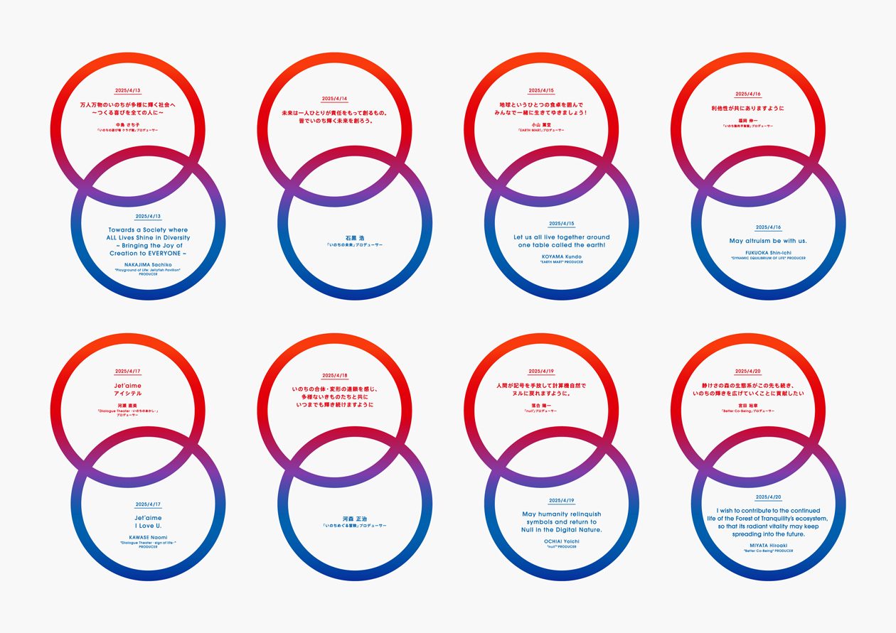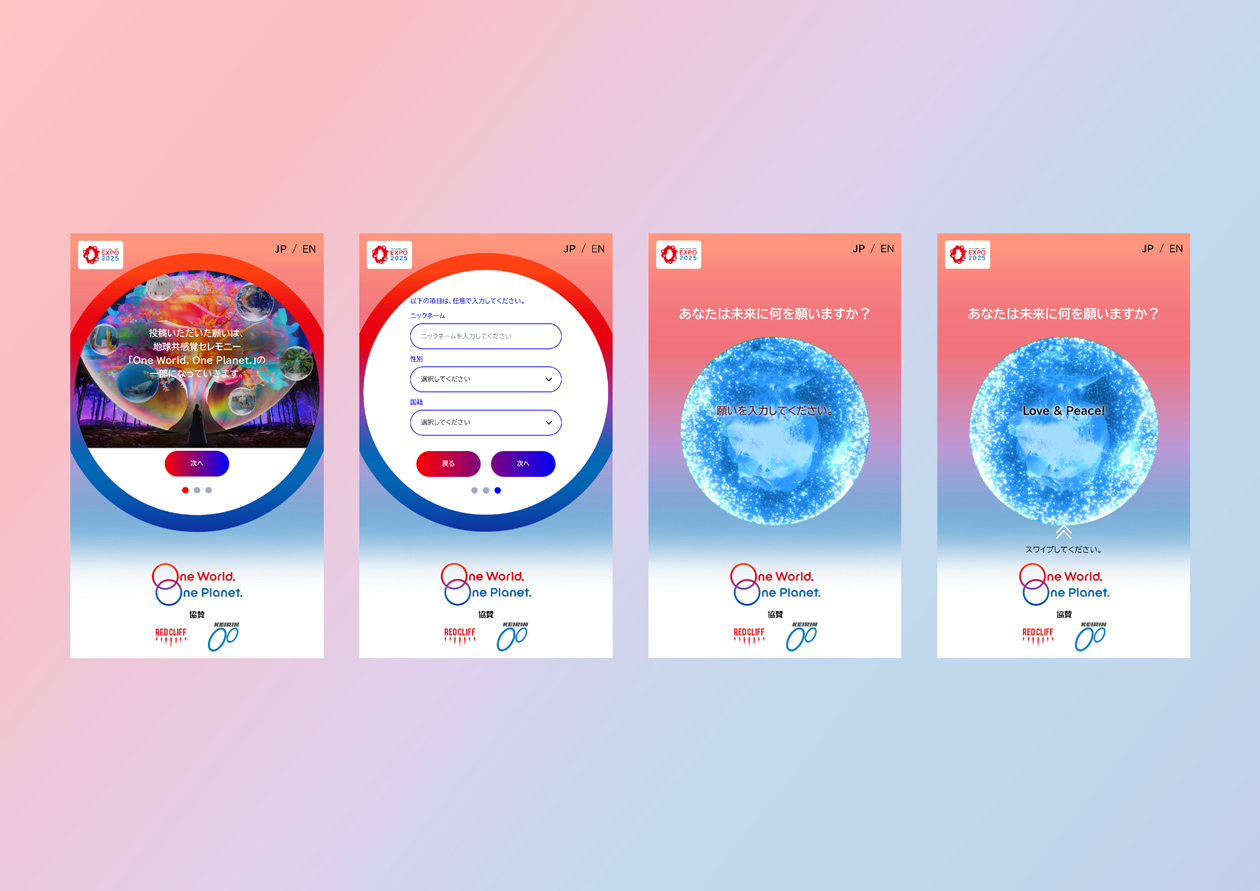 Art direction and design for “One World, One Planet.”, an event to be held every night for 184 days during the Expo 2025 Osaka, Kansai. “One World, One Planet.” is a simultaneous real and digital ceremony with the theme of ‘Wish’ that includes a drone show, projection mapping, lighting up of The Grand Ring, images of the CUBE monument, and a Virtual EXPO app. The 184 consecutive days of ceremonies utilizing the entire Expo site marked a first in Expo history and became a symbol of the nighttime Expo. It also recorded the highest attendance among all events at the Osaka-Kansai Expo. We were in charge of the art direction of the “One World, One Planet.” event, including the logo, key visuals, drone motifs, and other design elements.