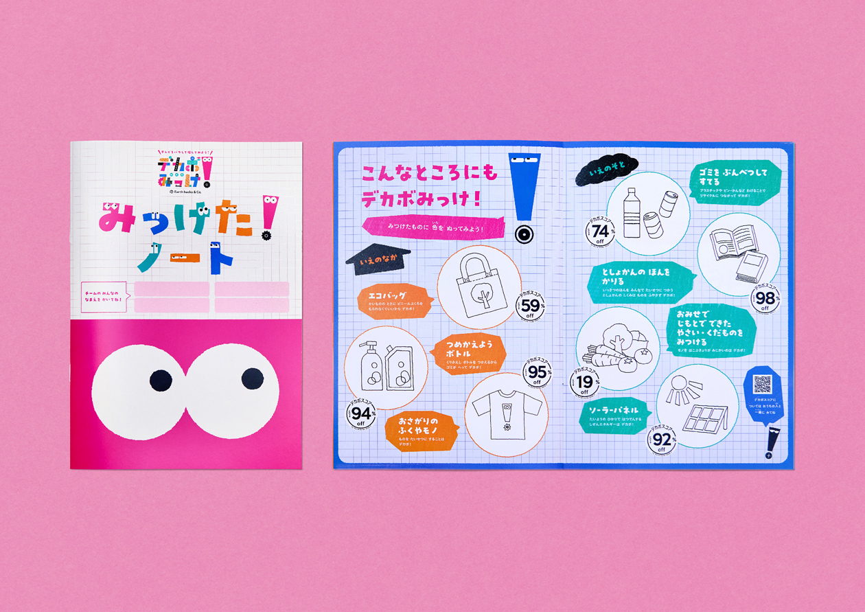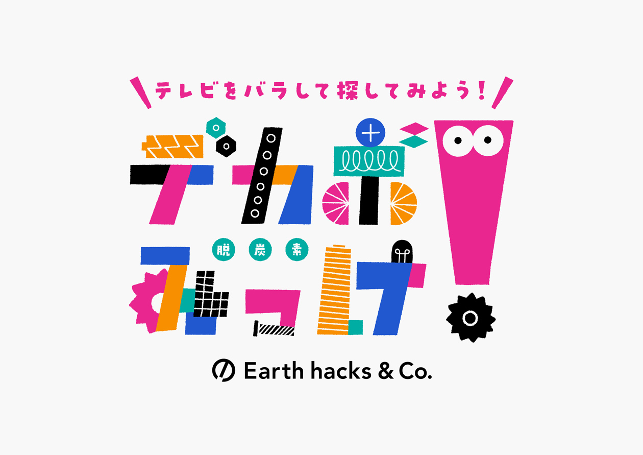 Earth hacks株式会社が展開する「デカボスコア」にちなんだワークショップ、『テレビをバラして探してみよう「デカボ(脱炭素)みっけ!」』のアートディレクション・デザインを担当しました。パナソニックのテレビを分解しながら、素材やリサイクルの仕組みを知り、見つけた“デカボなパーツ”のキャラクターカードを集めて「みっけた!ノート」を完成させるという内容のワークショップです。8月2日・3日に「汐留サマースクール2025」で行われ、連日満員の大盛況となりました。