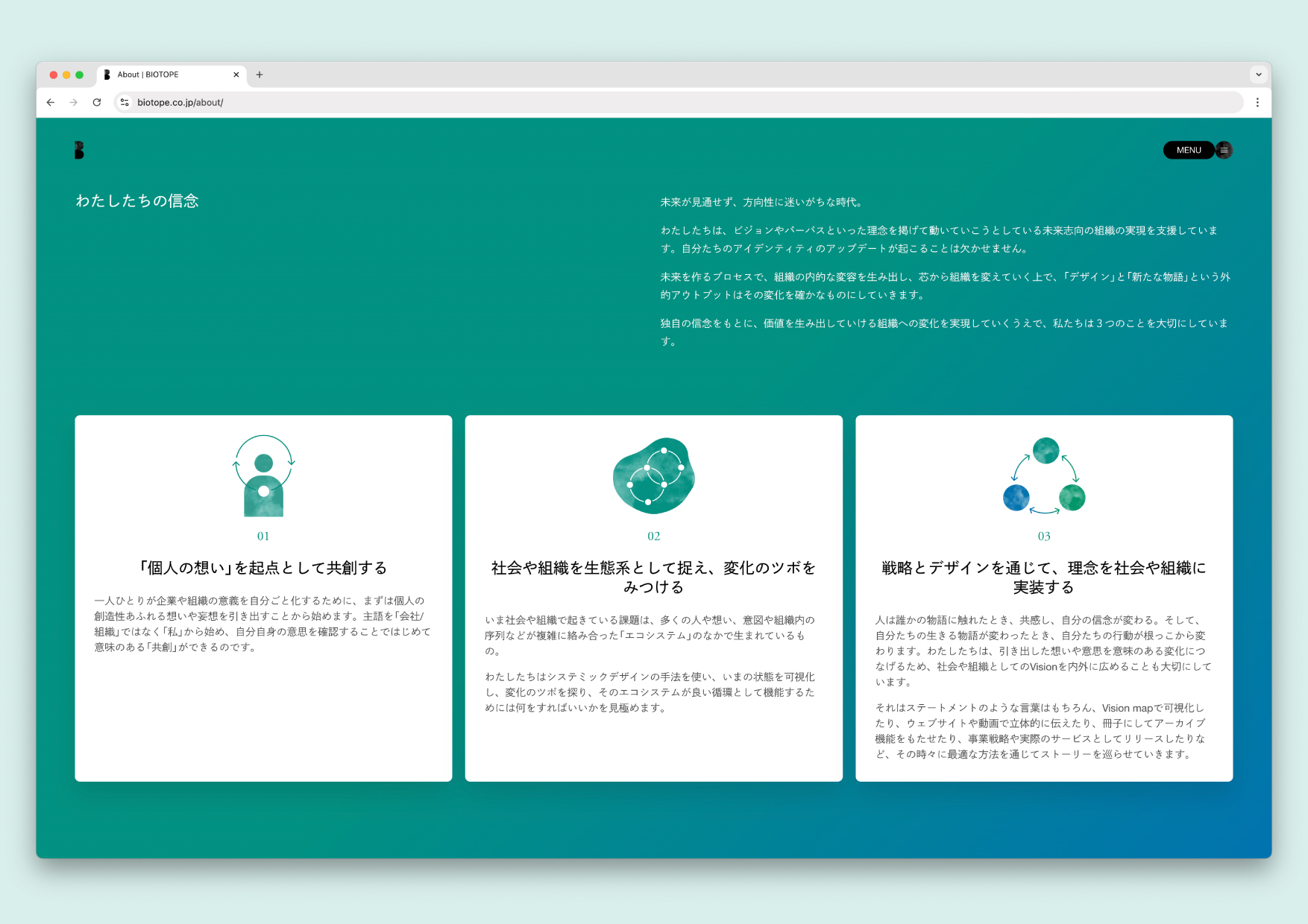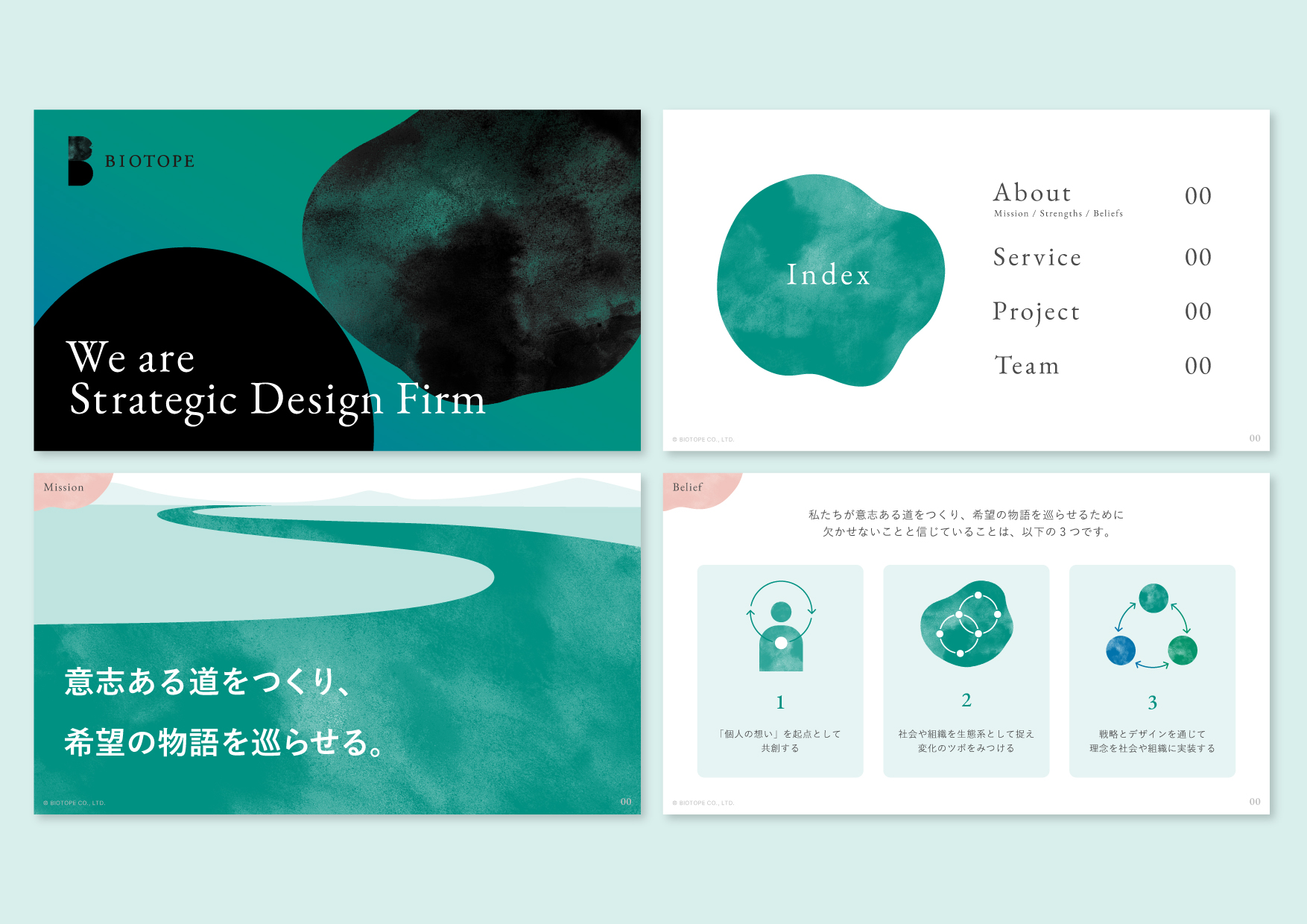 戦略デザインファームBIOTOPEのWebサイトリニューアルにあたり、カラーやフォントなどのVI設計、キービジュアルデザイン、Webコンセプトメイキング/ディレクション、図説デザインを担当しました。ロゴが持つ有機的な要素とソリッドな要素をもとに、二面性を表現したキービジュアルを制作。このビジュアルを軸に、Webサイトをはじめ、会社資料や各種ツールへと展開しました。キーカラーの“BIOTOPE GREEN” は、知性を想起させるブルーと、自然を象徴するグリーンが溶け合って生まれた独自の色として設定しています。