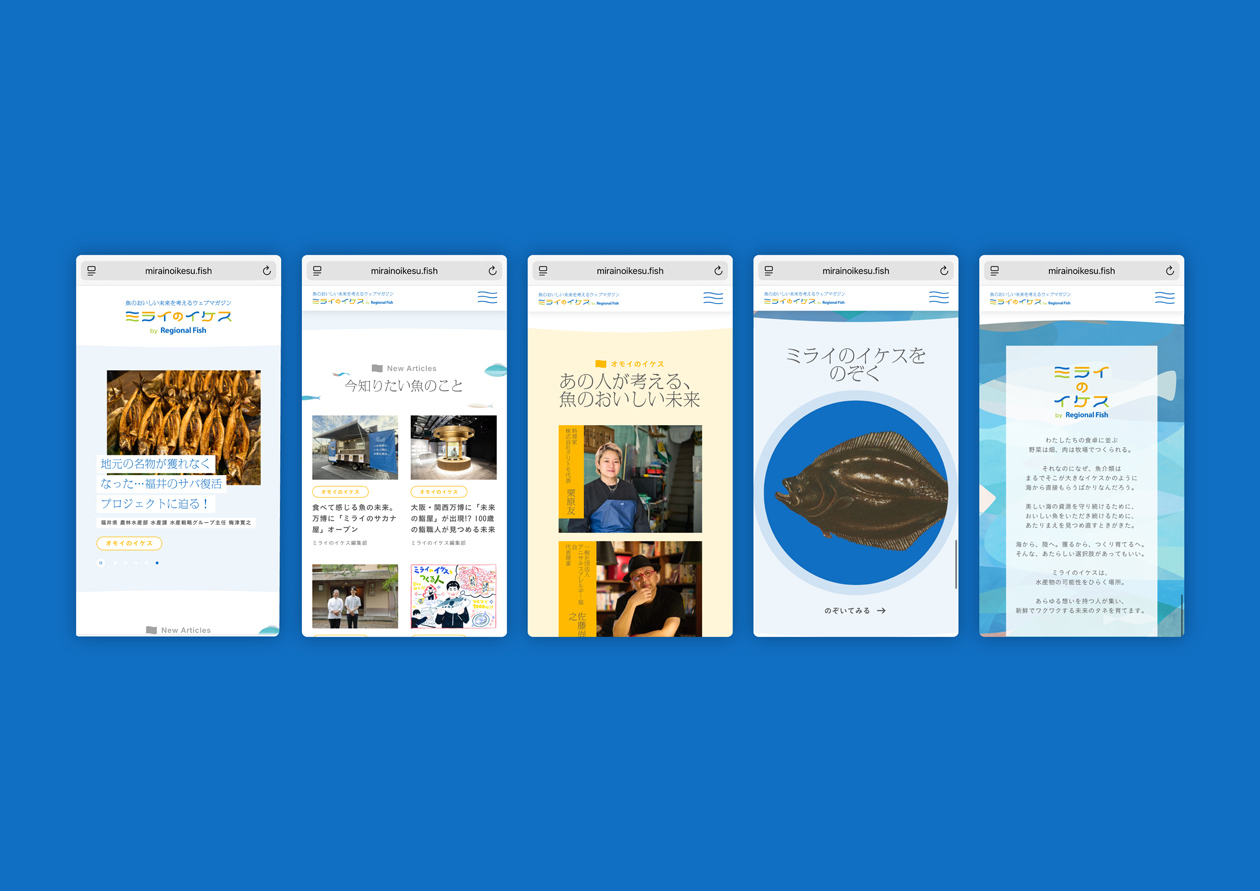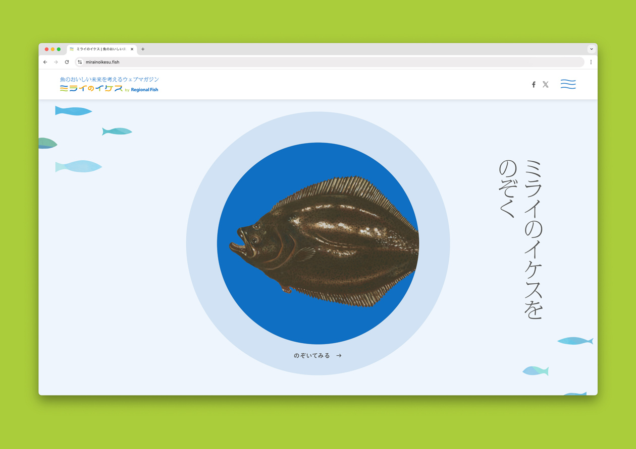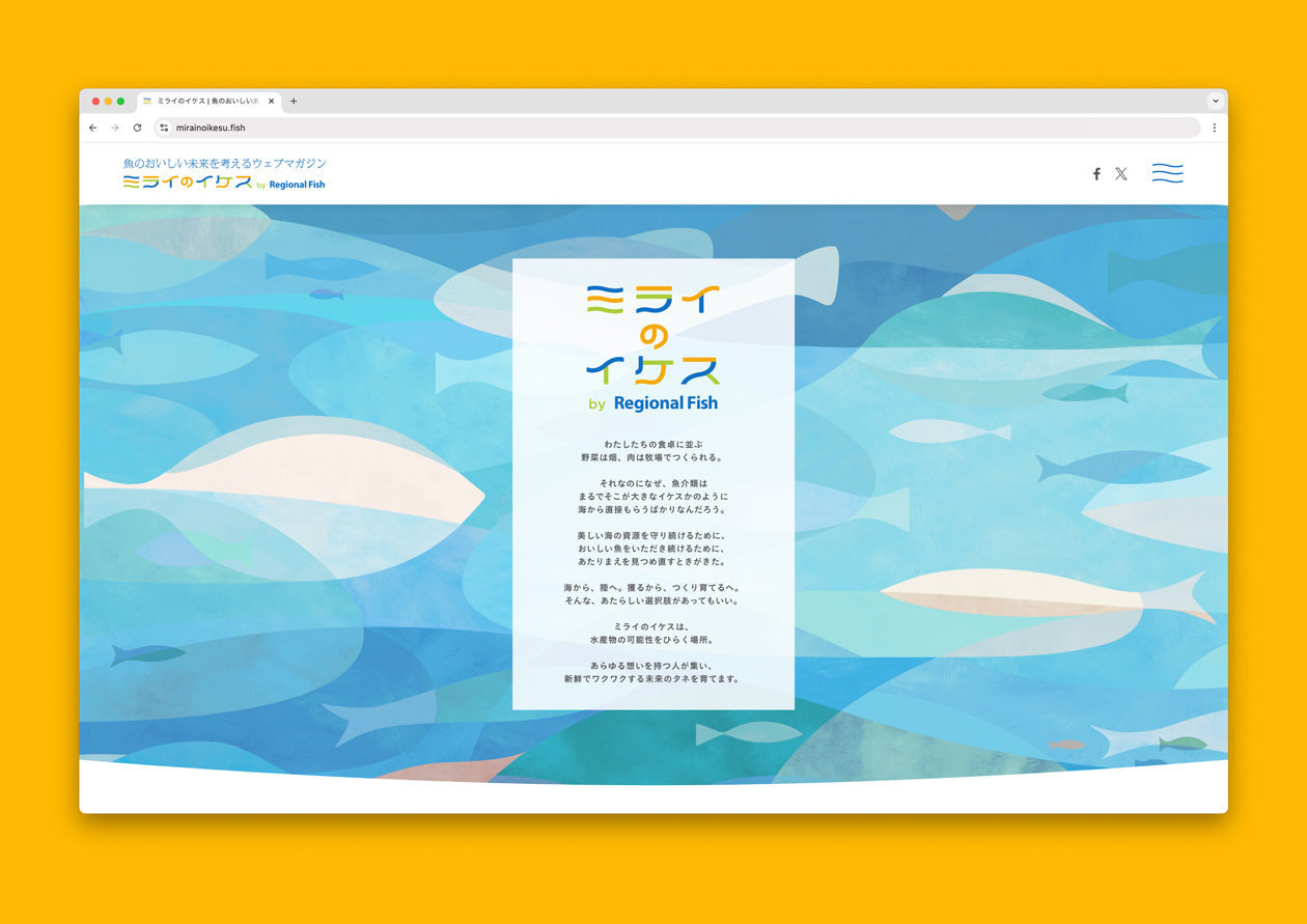 次世代水産養殖の技術開発を行うスタートアップ企業 Regional Fishによる、魚のおいしい未来を考えるウェブマガジン「ミライのイケス」のロゴ、キービジュアル、Webデザインを担当しました。Webマガジンとしての読みやすさを第一に考えシンプルにしつつも、イラストレーター中山信一さん作の魚たちが泳ぎ、まるでイケスの中に入り込んだようなWebデザインを目指しました。