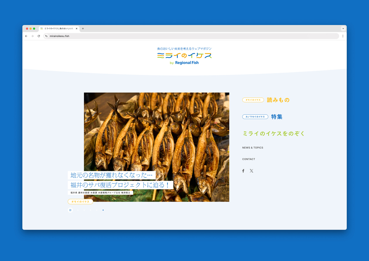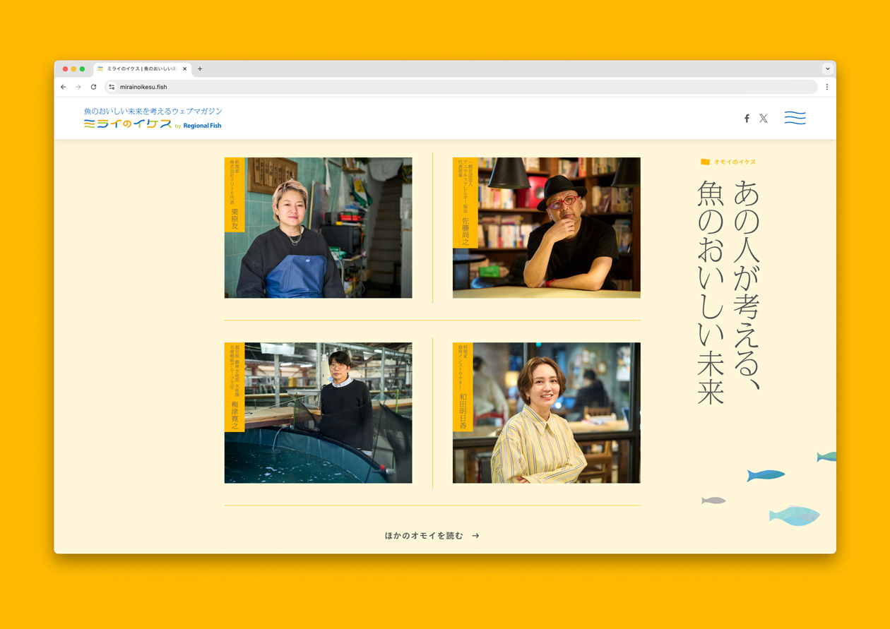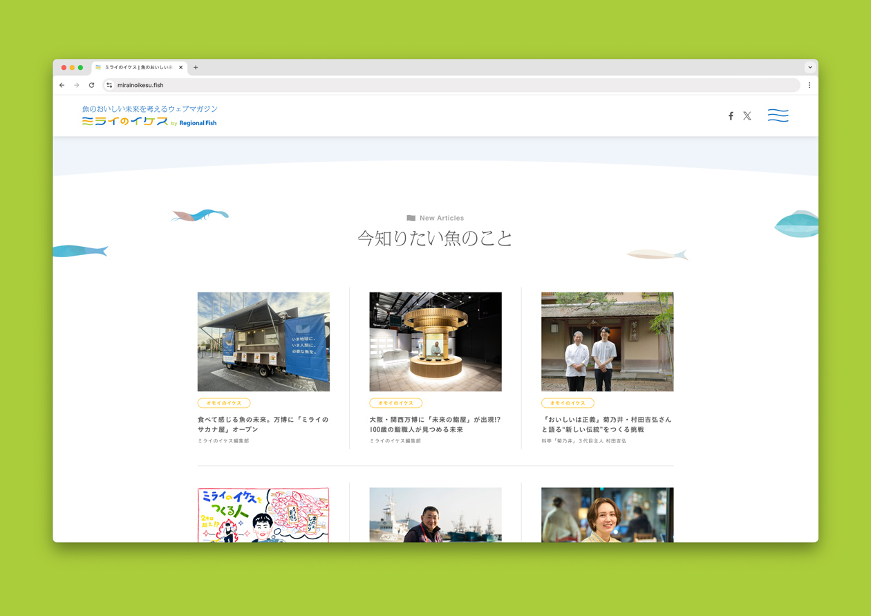 次世代水産養殖の技術開発を行うスタートアップ企業 Regional Fishによる、魚のおいしい未来を考えるウェブマガジン「ミライのイケス」のロゴ、キービジュアル、Webデザインを担当しました。Webマガジンとしての読みやすさを第一に考えシンプルにしつつも、イラストレーター中山信一さん作の魚たちが泳ぎ、まるでイケスの中に入り込んだようなWebデザインを目指しました。