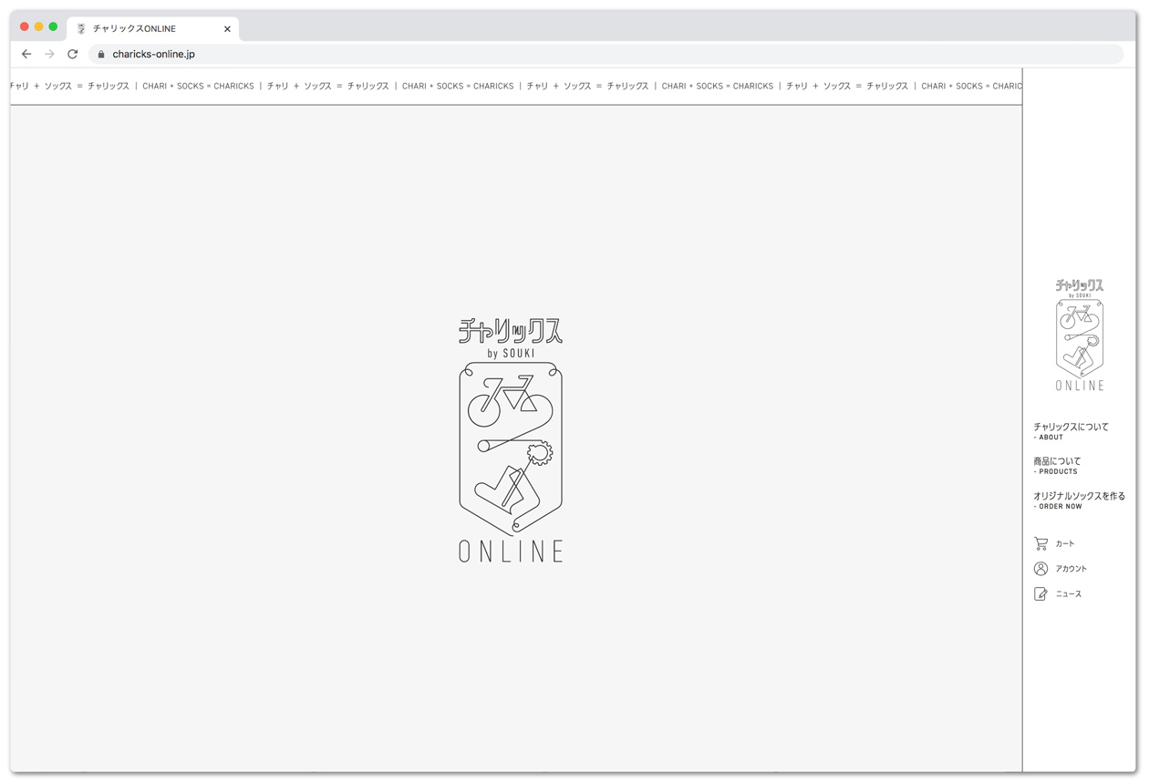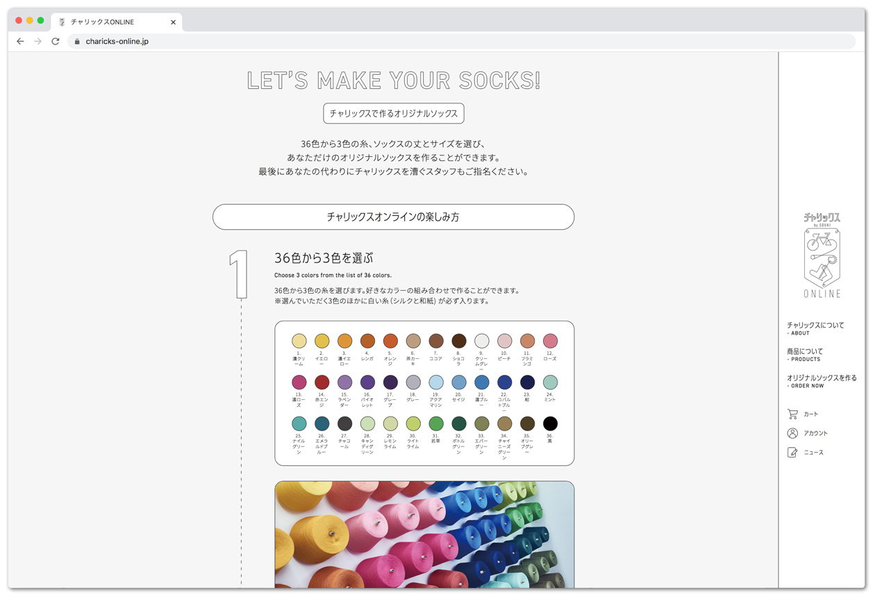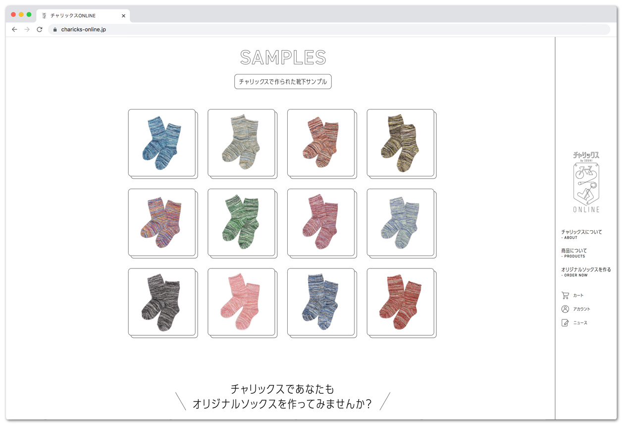 Branding project for "Charicks," the workshop by SOUKI, the sock factory in Nara. We were in charge of a wide range of direction and design, including the logo, packaging, and website for the "Charicks Online." The "Charicks" system allows users to choose 3 colors from 36 colors of yarn and combine them to knit an original sock by pedaling a bicycle for about 10 minutes. The logo, with its single stroke, expresses how a sock and an exciting experience are created from a single piece of yarn.