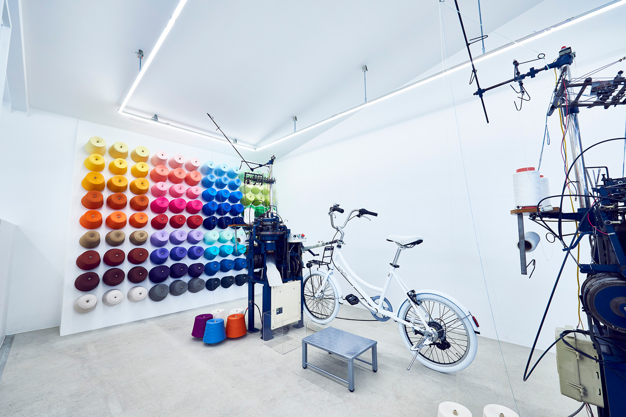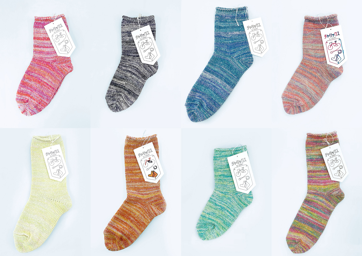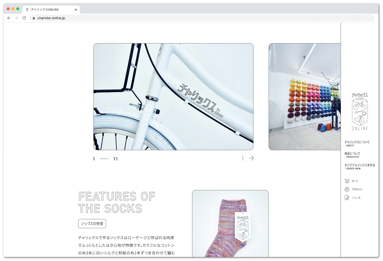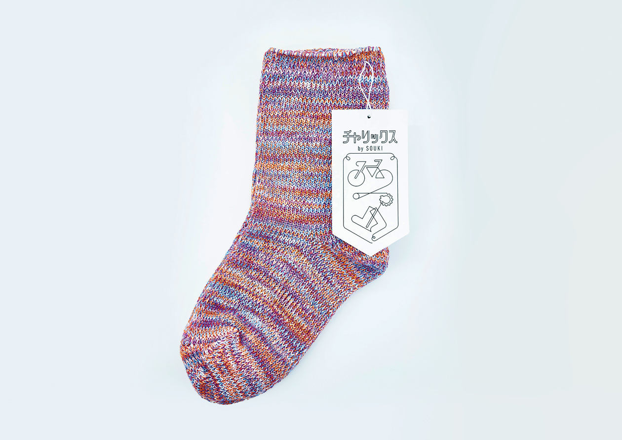 奈良県の靴下工場である創喜によるワークショップ「チャリックス」のブランディングプロジェクト。ロゴ、パッケージ、オンラインサービス「チャリックス ONLINE」のWebサイトなど幅広くディレクション・デザインを担当しています。「チャリックス」は36色の糸から3色を選んで組み合わせ、自転車を10分ほど漕ぐことでオリジナルの靴下が編み上がるというシステム。一本の糸から靴下やワクワクする体験が作り出される様子を、一筆書きのロゴで表現しています。開発されてから多くのメディアに取り上げられ、「チャリックス」を体験するために多くの人が創喜のS.Laboに訪れています。