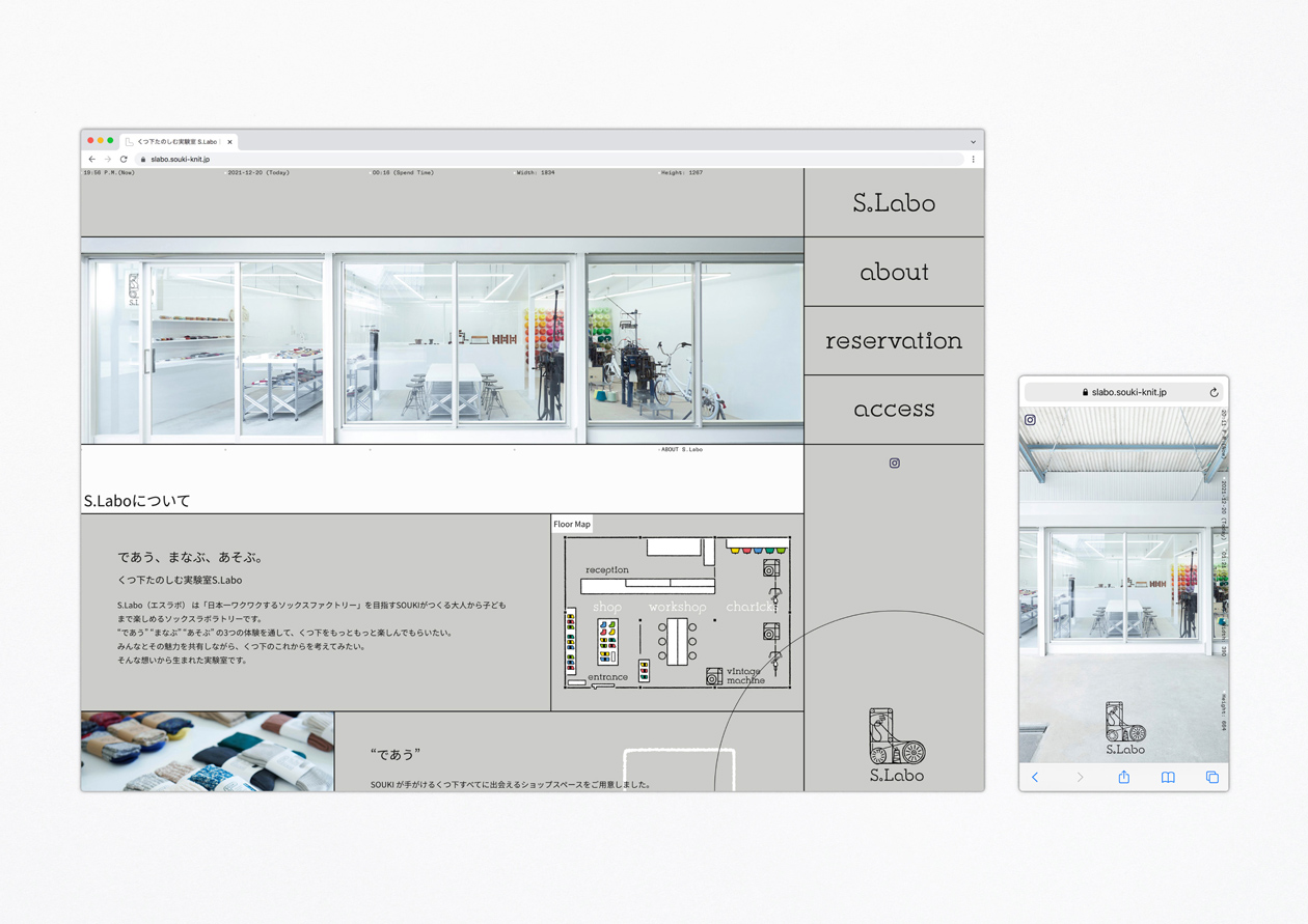 Branding project for "S.Labo", a workshop facility by SOUKI, a sock factory. We were involved in a wide range of projects including concept creation, naming, logo, space, signage, original fonts, web and SNS supervision. Based on the concept of "A laboratory to enjoy socks," S.Labo consists of three spaces where visitors can experience a store, a workshop, and Charicks. We have created an exciting worldview so that visitors can enjoy socks and think about the future of sock industry, a local industry in Koryocho, Nara Prefecture. Since its opening, the facility has received a variety of media coverage and has attracted visitors from far and wide.