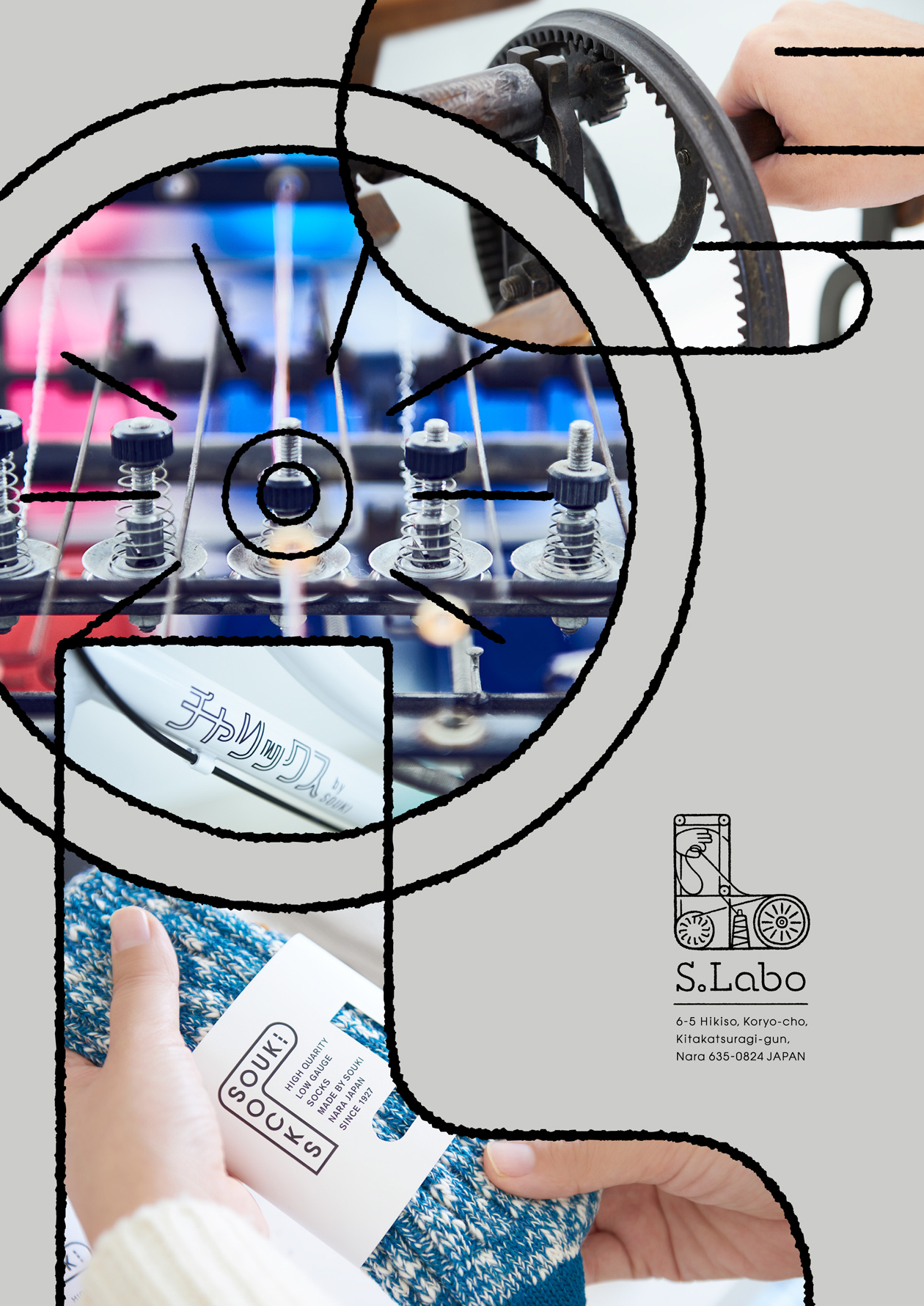 靴下工場である創喜によるワークショップ施設「S.Labo」のブランディングプロジェクト。コンセプトメイキングやネーミング、ロゴ、空間、サイン、オリジナルフォント、Web、SNS監修など幅広く手掛けています。「くつ下たのしむ実験室」というコンセプトを元に、ショップ、ワークショップ、チャリックスそれぞれを体験できる3つの空間で構成しています。靴下を楽しむことで奈良県広陵町の地場産業である靴下づくりの未来を考えるきっかけとなるよう、ワクワクする世界観作りをしています。オープン以来さまざまなメディアの取材を受け、遠方から訪れる人も多い施設となっています。