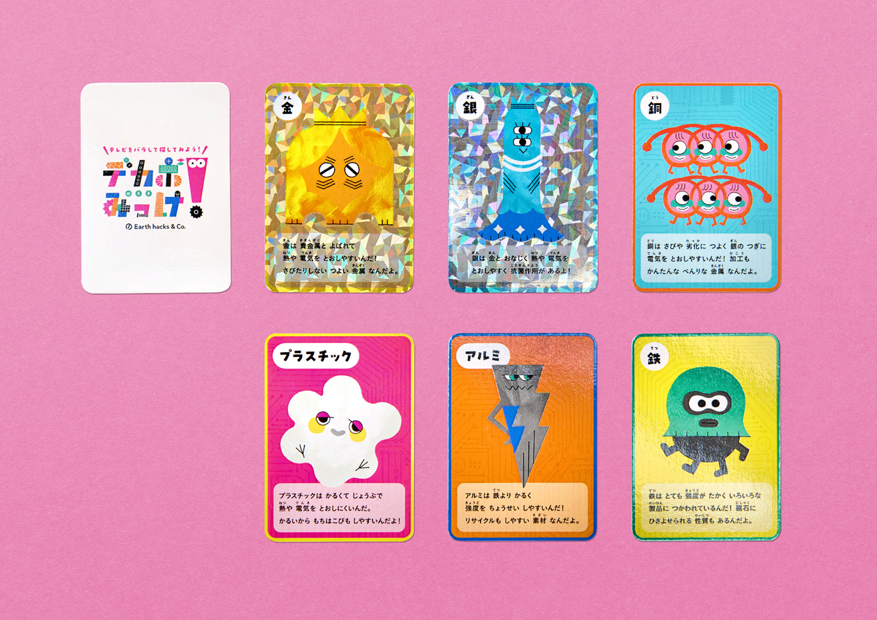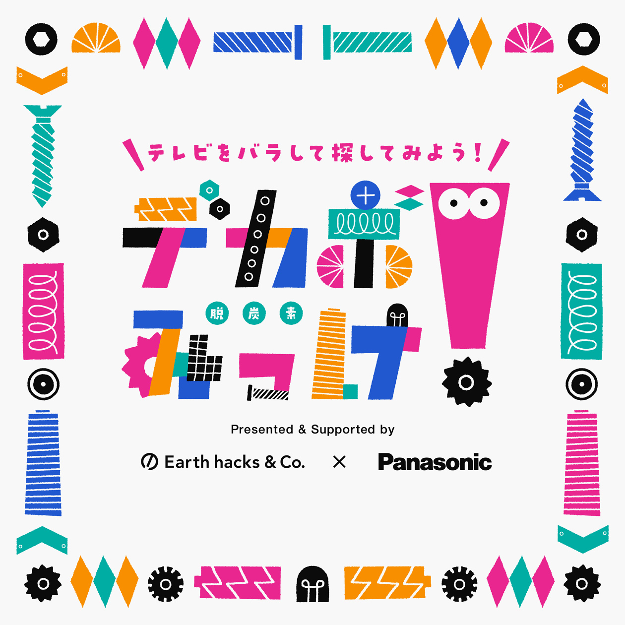 Earth hacks株式会社が展開する「デカボスコア」にちなんだワークショップ、『テレビをバラして探してみよう「デカボ(脱炭素)みっけ!」』のアートディレクション・デザインを担当しました。パナソニックのテレビを分解しながら、素材やリサイクルの仕組みを知り、見つけた“デカボなパーツ”のキャラクターカードを集めて「みっけた!ノート」を完成させるという内容のワークショップです。8月2日・3日に「汐留サマースクール2025」で行われ、連日満員の大盛況となりました。
