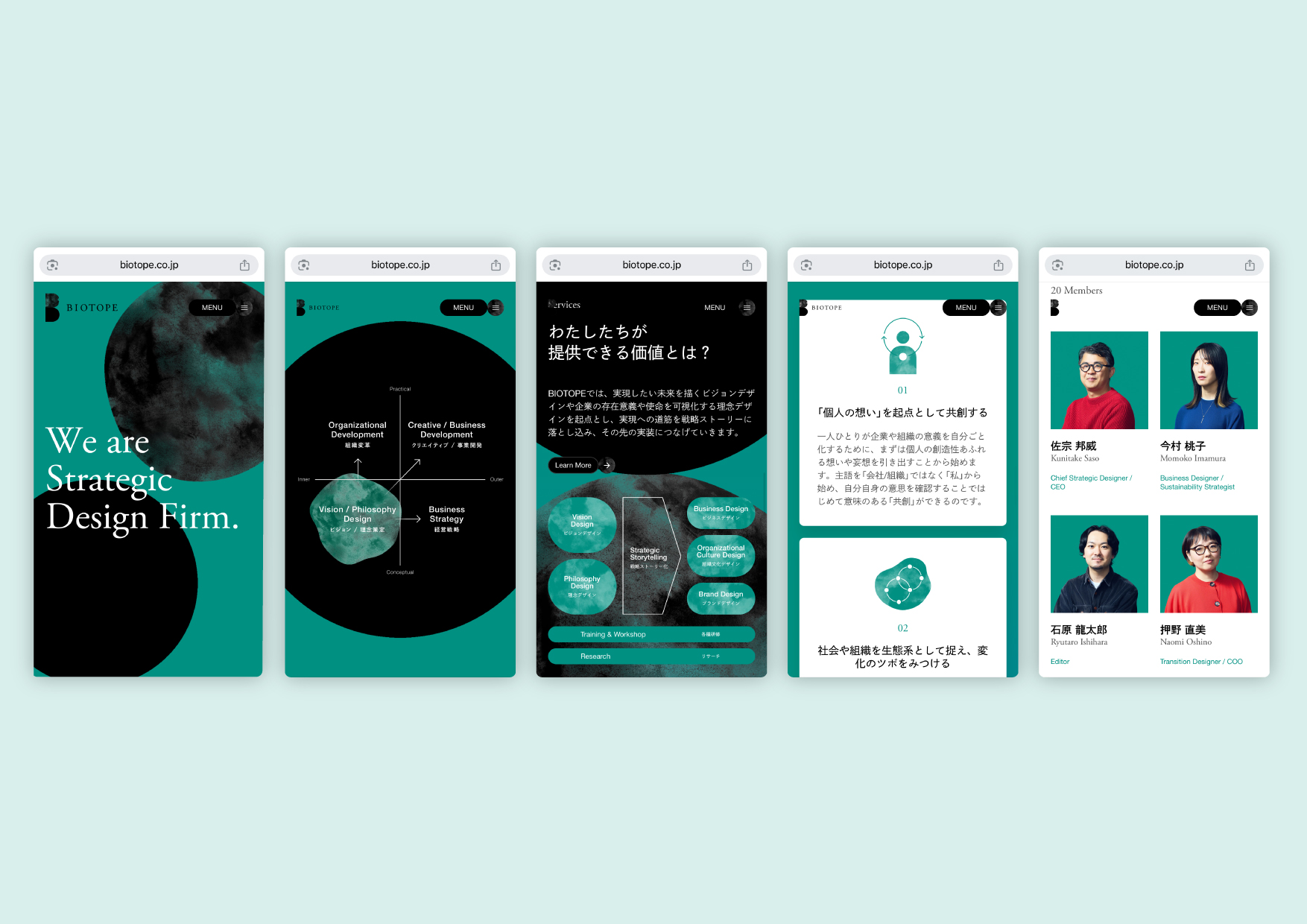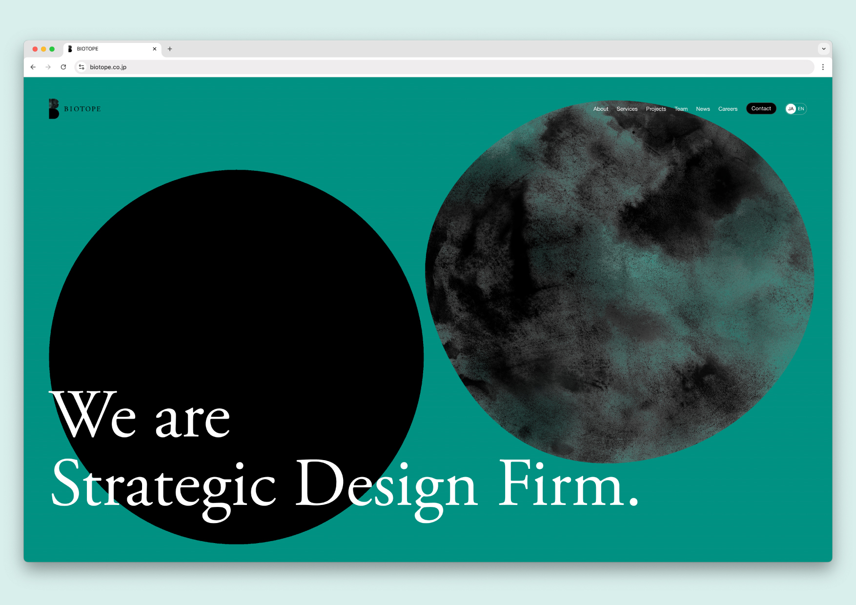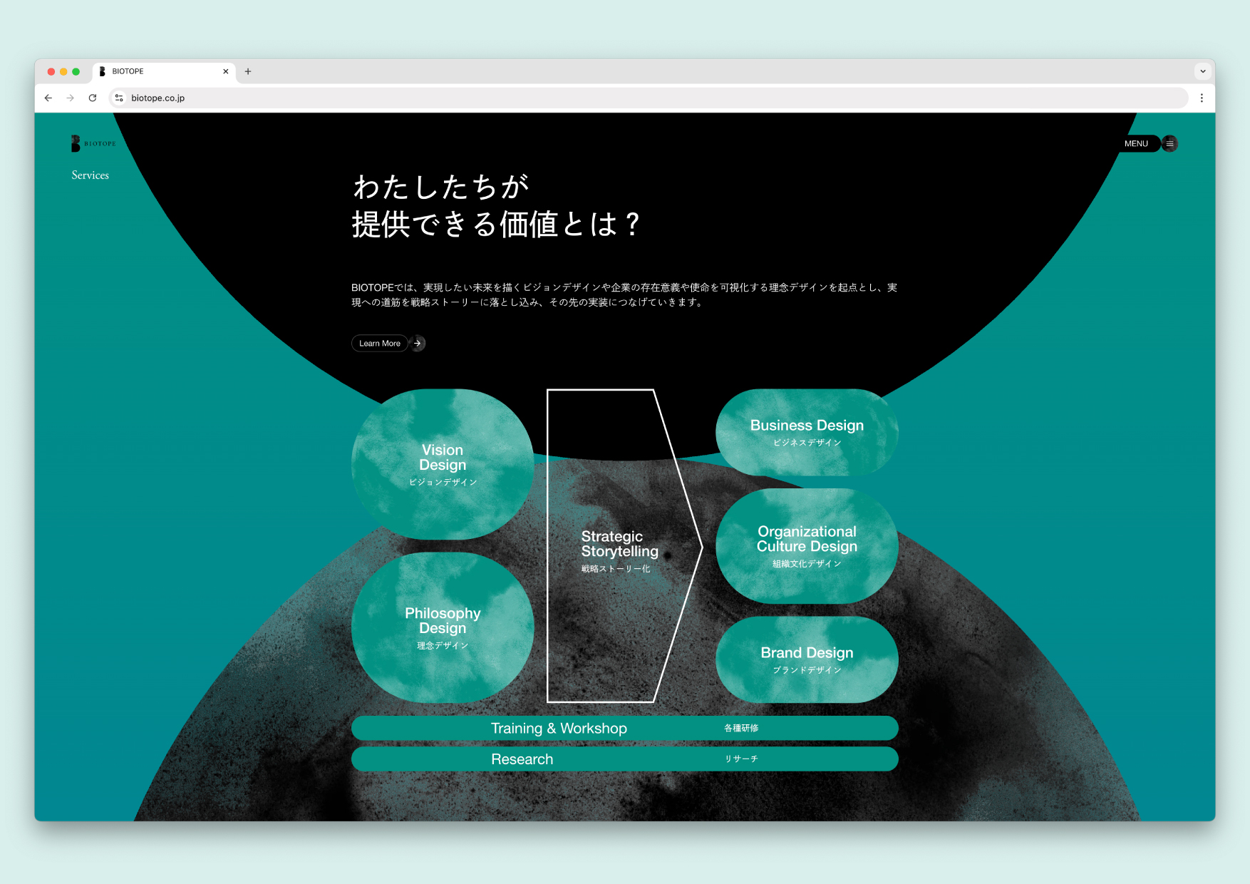 戦略デザインファームBIOTOPEのWebサイトリニューアルにあたり、カラーやフォントなどのVI設計、キービジュアルデザイン、Webコンセプトメイキング/ディレクション、図説デザインを担当しました。ロゴが持つ有機的な要素とソリッドな要素をもとに、二面性を表現したキービジュアルを制作。このビジュアルを軸に、Webサイトをはじめ、会社資料や各種ツールへと展開しました。キーカラーの“BIOTOPE GREEN” は、知性を想起させるブルーと、自然を象徴するグリーンが溶け合って生まれた独自の色として設定しています。